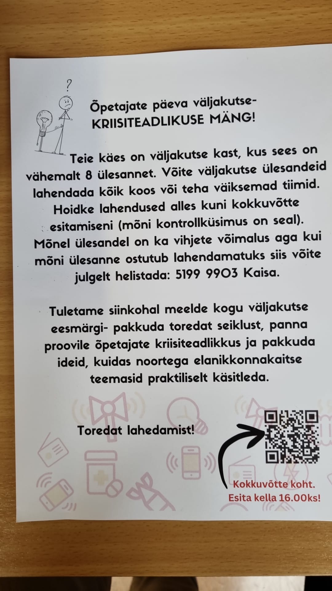 Sellel ajal, kui meie uued õpetajad oma ametiga tutvusid mängisid meie nii-öelda päris õpetajad kriisiteadlikkuse mängu, mille eesmärgiks oli pakkuda toredat seiklust, panna õpetajaid proovile õpetajate kriisiteadlikkuses ning pakkuda ideid, kuidas noortega elanikkonnakaitse teemasid praktiliselt käsitleda.